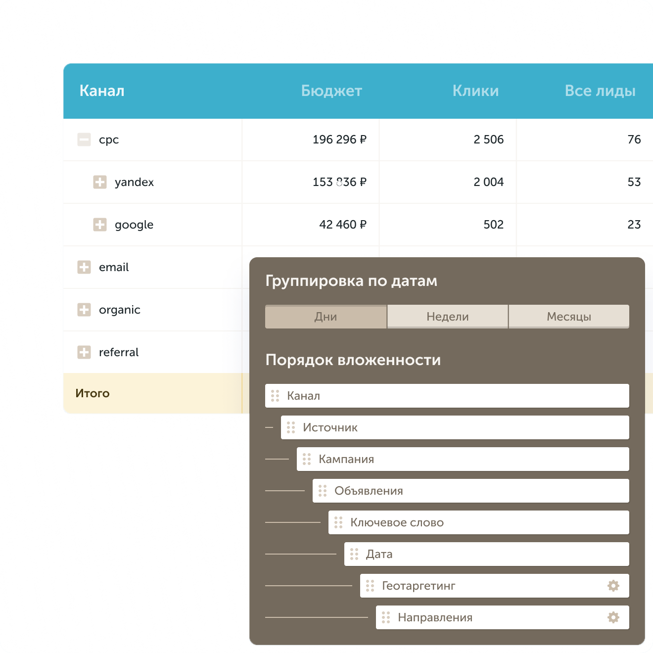 - Работа в одном окне: На одном экране удобнее видеть полную картину эффективности маркетинга, вместо того чтобы переключаться между разными системами. Это экономит время и упрощает анализ данных.