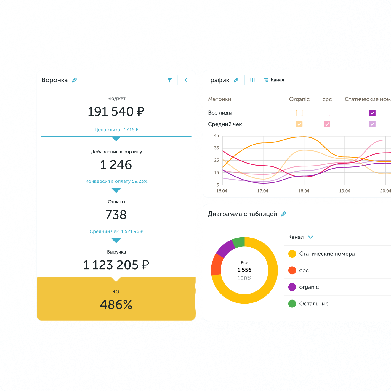 - Автоматизация работы с данными: Сквозная аналитика Calltouch собирает статистику по бюджетам, показам, кликам, звонкам, сделкам и выручке. Инструмент помогает проанализировать все ваши источники трафика и рекламные каналы, формируя подробные отчеты и наглядные дашборды за несколько секунд.